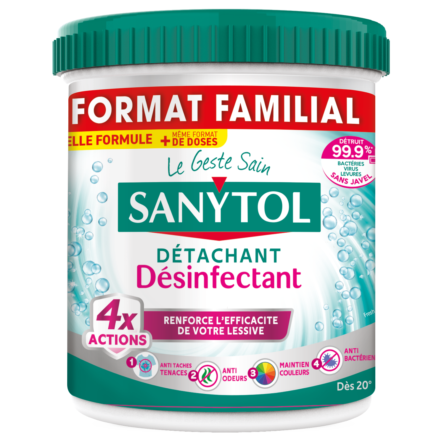 SANYTOL, l’expert de la désinfection sans javel, a développé un détachant 4x ACTIONS, qui élimine microbes, mauvaises odeurs, taches tenaces dès 20°C et qui maintient les couleurs lavage après lavage. Sa formule enrichie en enzymes pénètre au cœur des fibres textiles et libère des agents de détachage pour un résultat impeccable. Sa formule unique, testée dermatologiquement, élimine plus efficacement les mauvaises odeurs qu’une lessive utilisée seule et elle offre 12h de fraicheur aux vêtements humides laissés dans le tambour.