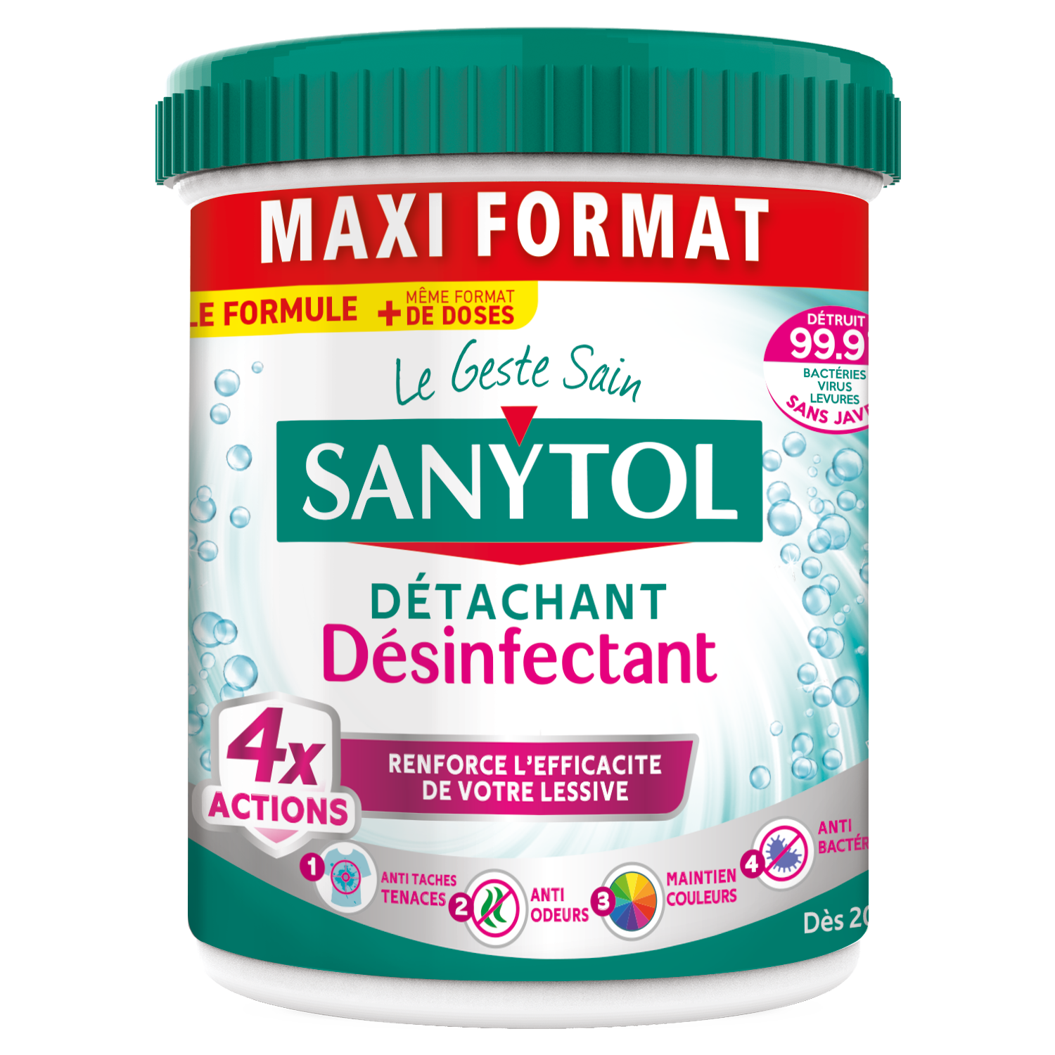 SANYTOL, l’expert de la désinfection sans javel, a développé un détachant 4x ACTIONS, qui élimine microbes, mauvaises odeurs, taches tenaces dès 20°C et qui maintient les couleurs lavage après lavage. Sa formule enrichie en enzymes pénètre au cœur des fibres textiles et libère des agents de détachage pour un résultat impeccable. Sa formule unique, testée dermatologiquement, élimine plus efficacement les mauvaises odeurs qu’une lessive utilisée seule et elle offre 12h de fraicheur aux vêtements humides laissés dans le tambour.