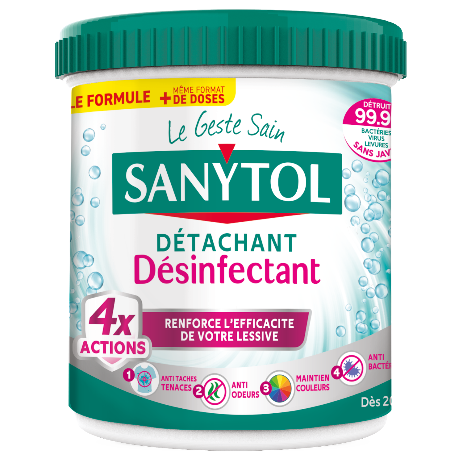 SANYTOL, l’expert de la désinfection sans javel, a développé un détachant 4x ACTIONS, qui élimine microbes, mauvaises odeurs, taches tenaces dès 20°C et qui maintient les couleurs lavage après lavage. Sa formule enrichie en enzymes pénètre au cœur des fibres textiles et libère des agents de détachage pour un résultat impeccable. Sa formule unique, testée dermatologiquement, élimine plus efficacement les mauvaises odeurs qu’une lessive utilisée seule et elle offre 12h de fraicheur aux vêtements humides laissés dans le tambour.